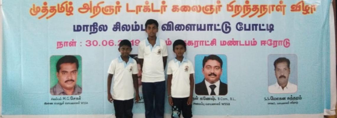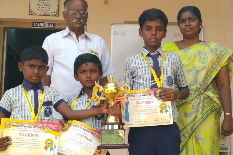 Our School IV std student Maria Antony Jebiston,Melkin Jenith and VIII std student B.Rohith had won First,Second and Third prize respective in World Silambam Championship - 2019 held at Erode.This event was organised by Sports Development Authority of Tamil Nadu.