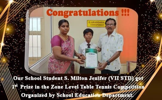Our School student S. Milton Jenifer - VII std got 1st prize in the Zone Level Table Tennis Competition organized by School Education Department.