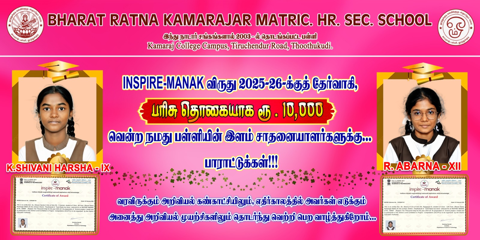 We proudly congratulate our students for being selected for the Inspire Manak Award 2025-2026 and they have been awarded a cash prize of Rs. 10,000/-.We wish them continued success in all their future scientific endeavors.