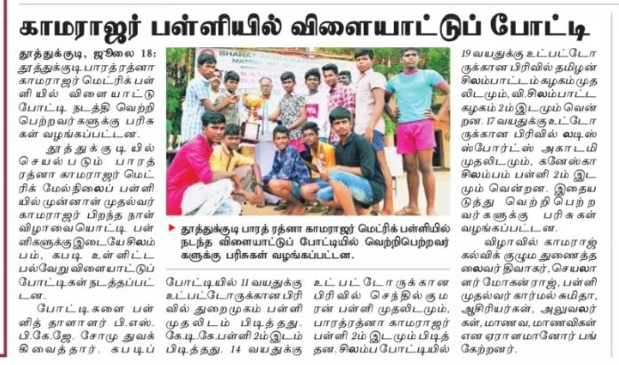 Our school students have participated in the Interschool Kabaddi and Silambam Tournaments and won second prize in Kabaddi and won many prizes in Silambam.