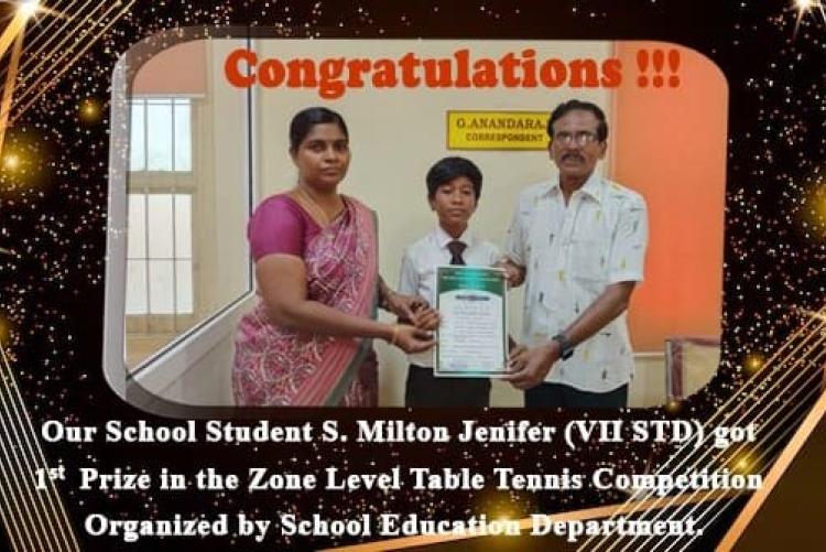 Our School student S. Milton Jenifer - VII std got 1st prize in the Zone Level Table Tennis Competition organized by School Education Department.